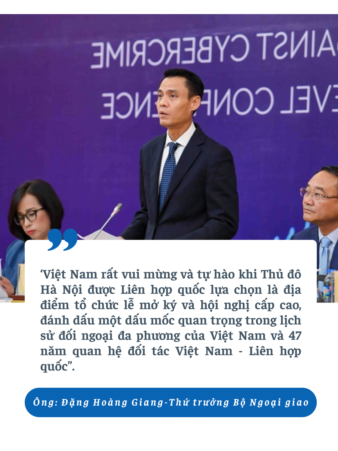 Phát biểu tại họp báo, Thứ trưởng Bộ Ngoại Giao Đặng Hoàng Giang cho biết: 'Tình hình thế giới và khu vực diễn biến phức tạp, trong đó tội phạm mạng nổi lên như một thách thức, mối đe dọa rất nguy hiểm đối với an ninh, chủ quyền và toàn vẹn lãnh thổ của các quốc gia, đặt ra yêu cầu cấp bách cho các nước trong việc tăng cường hợp tác quốc tế và xây dựng khuôn khổ pháp lý toàn cầu để ứng phó với mối nguy hại này".