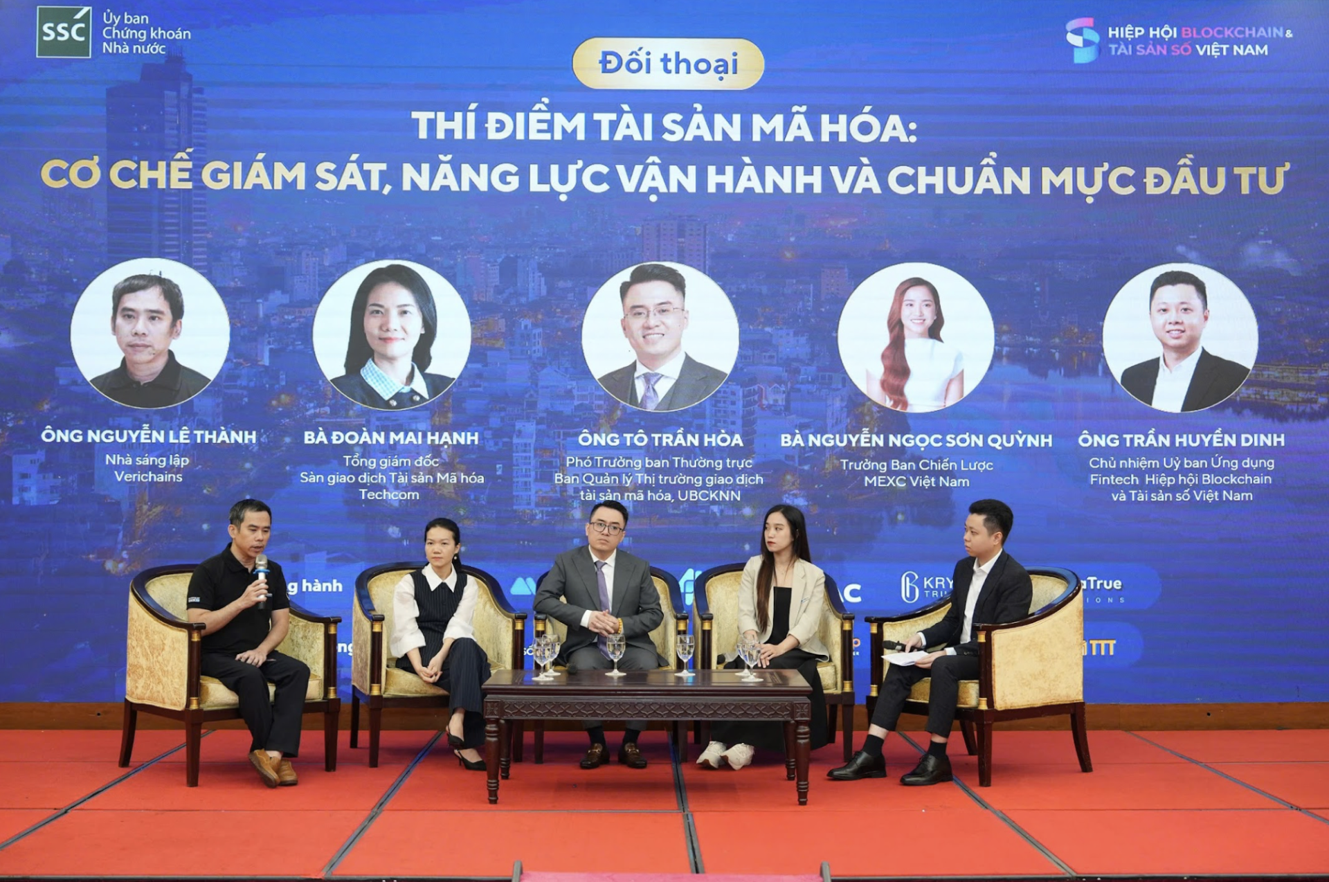 Từ trái sang phải) Ông Nguyễn Lê Thành (Verichains), bà Đoàn Mai Hạnh (TCEX), ông Tô Trần Hòa (UBCKNN), bà Nguyễn Ngọc Sơn Quỳnh (MEXC Việt Nam) và ông Trần Huyền Dinh (VBA) trao đổi về việc thí điểm sàn giao dịch tài sản mã hóa. |