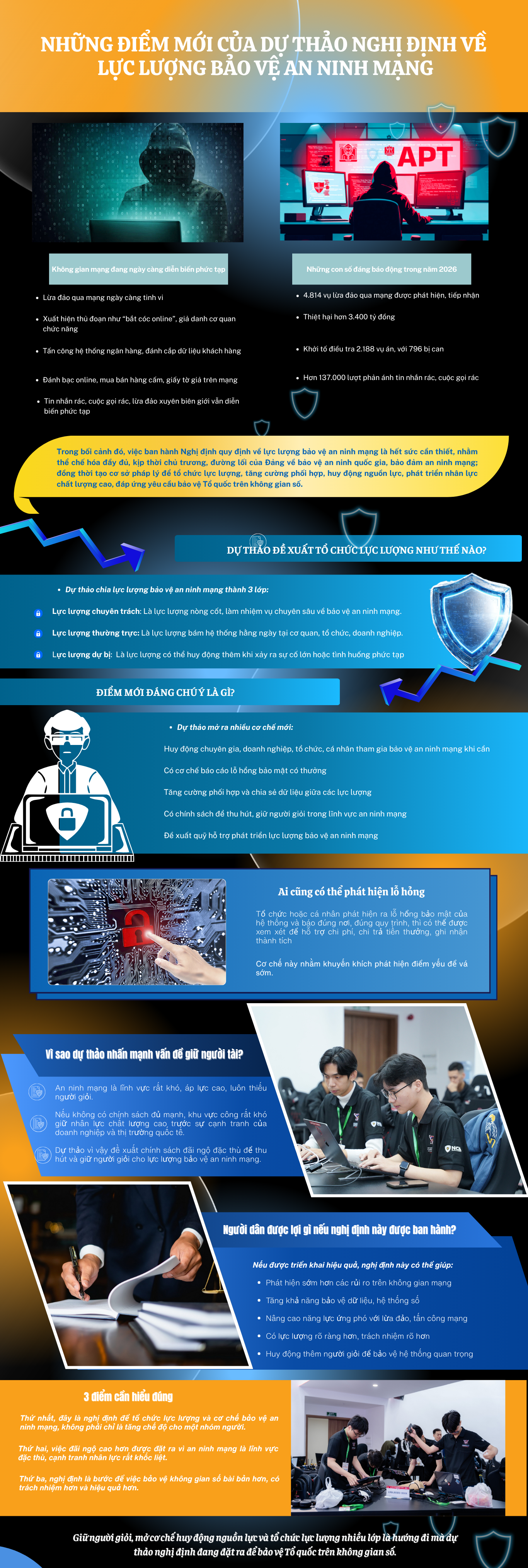 Dự thảo Nghị định về lực lượng bảo vệ an ninh mạng có nhiều điểm mới về tổ chức lực lượng, cơ chế huy động nguồn lực xã hội, chính sách thu hút nhân lực chất lượng cao và khuyến khích phát hiện sớm lỗ hổng bảo mật. Trong bối cảnh tội phạm mạng ngày càng tinh vi, dự thảo được kỳ vọng sẽ tạo thêm nền tảng pháp lý để nâng cao năng lực bảo vệ không gian số.