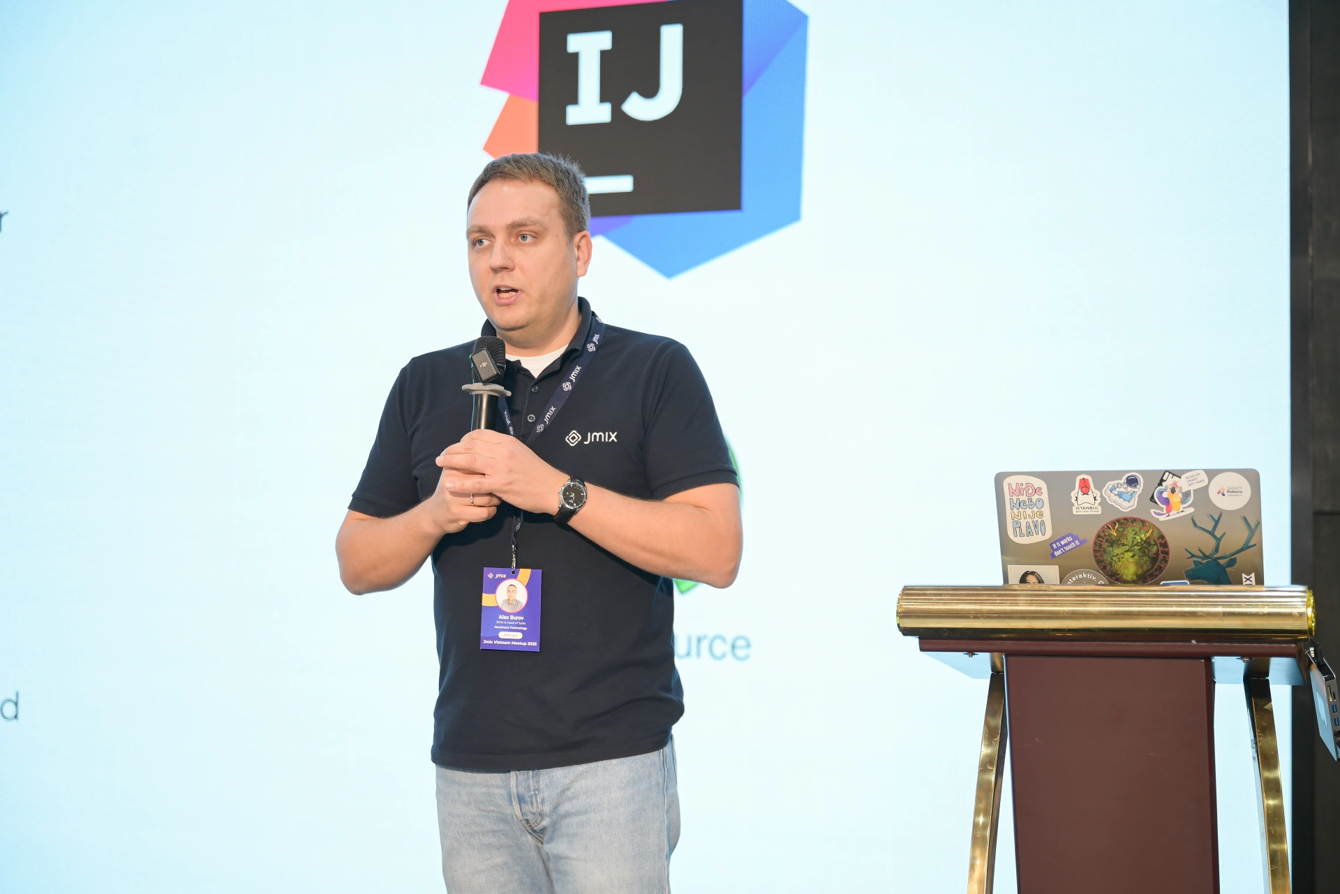 Cụ thể, các diễn giả đã chia sẻ kinh nghiệm thực tế và góc nhìn chuyên môn về việc ứng dụng Jmix trong phát triển phần mềm doanh nghiệp. Hai đại diện đến từ Jmix là ông Alex Burov giới thiệu giải pháp Java “less-code” cho các dự án thực tế, trong khi ông Konstantin Krivopustov nói về khái niệm và lợi thế thực tiễn dành cho các đội ngũ Java hiệu suất cao.