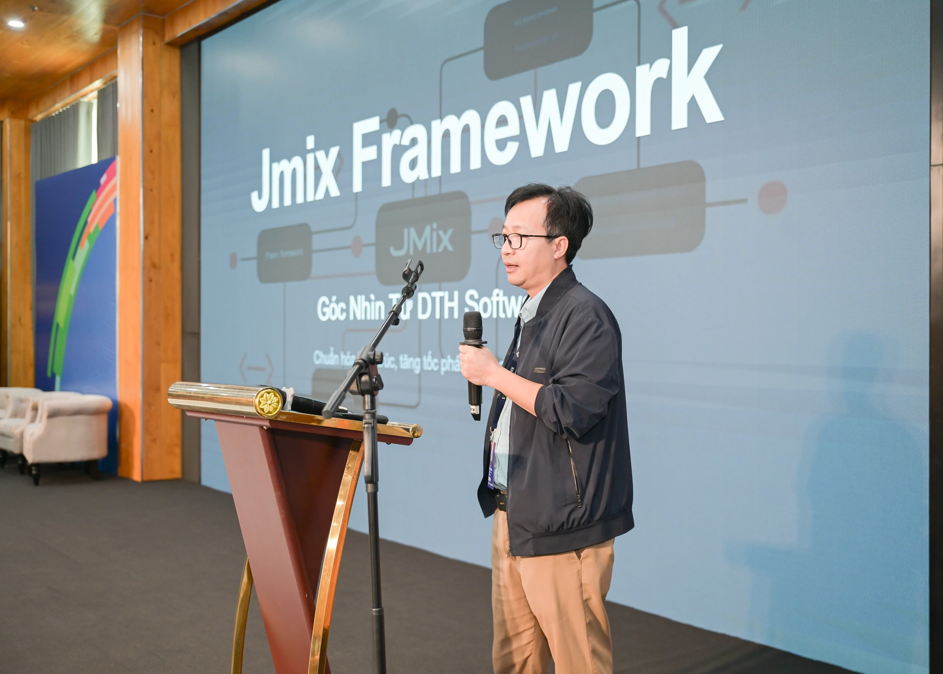 Bên cạnh đó, ông Nguyễn Tiến Hà – CTO của DTH Software mang đến góc nhìn về hành trình ứng dụng Jmix tại Việt Nam, giúp người tham dự hình dung rõ hơn tiềm năng của nền tảng này trong việc tối ưu chi phí, thời gian và nguồn lực. Các phiên thảo luận đã cung cấp cái nhìn toàn diện về lợi ích của mô hình “less-code” và xu hướng phát triển công nghệ trong tương lai.
