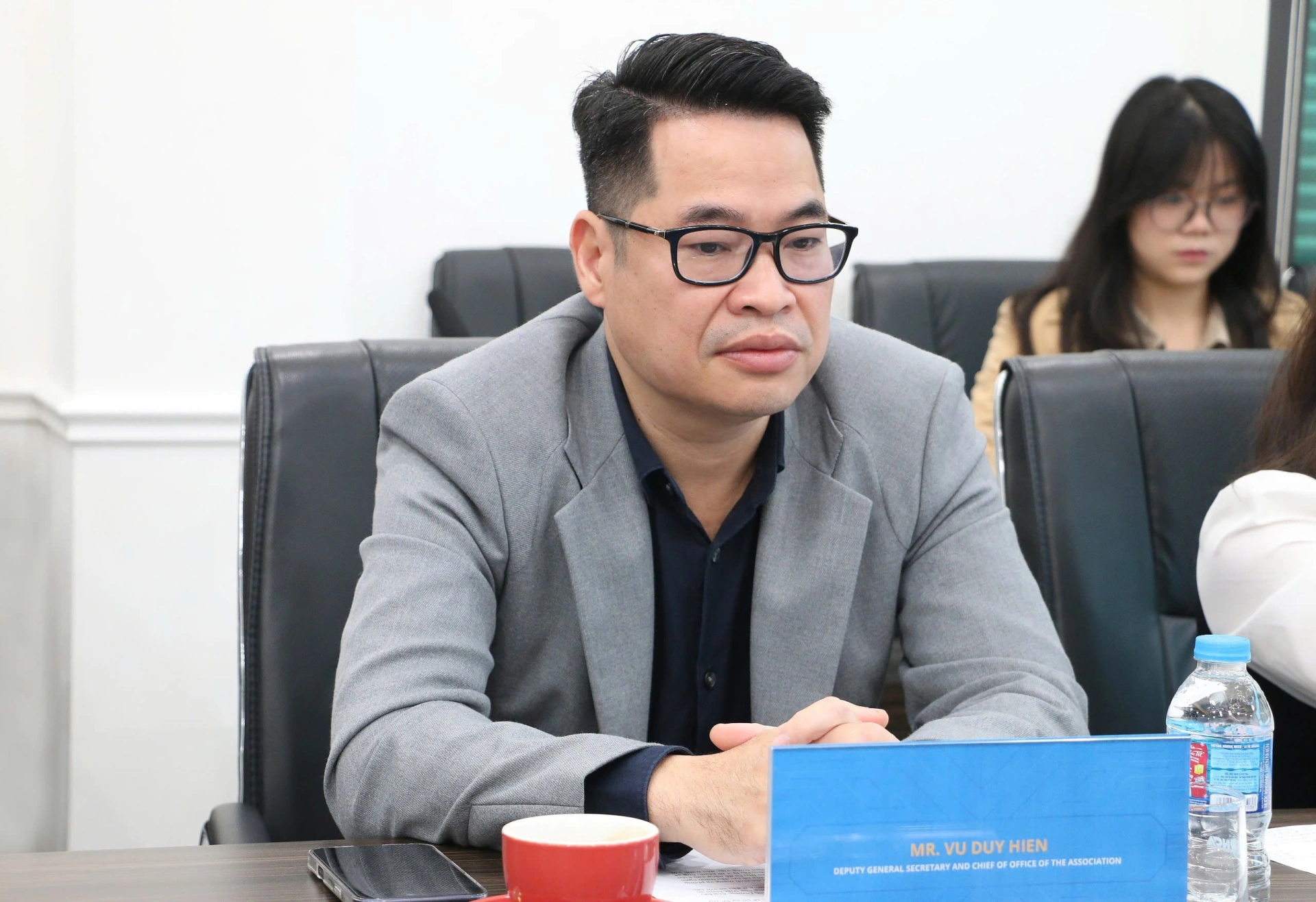 | Ông Vũ Duy Hiền - Phó Tổng thư ký kiêm Chánh Văn phòng Hiệp hội An ninh mạng quốc gia phát biểu tại buổi làm việc. |