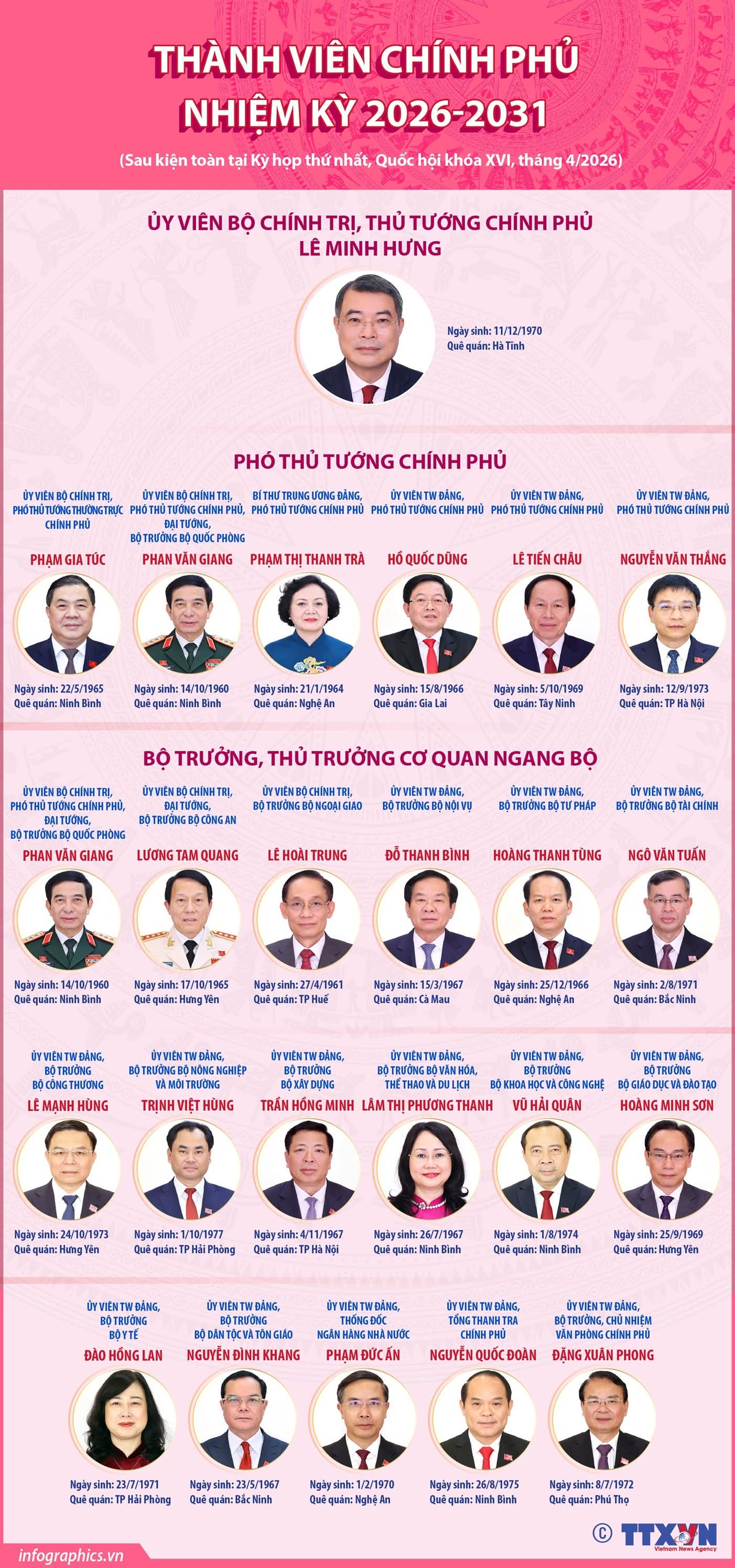 Cùng với chức danh Bộ trưởng Bộ Công an, Quốc hội đã phê chuẩn bổ nhiệm 16 đồng chí khác giữ chức vụ Bộ trưởng và Thủ trưởng cơ quan ngang Bộ, hoàn thiện bộ khung hành pháp cho nhiệm kỳ 2026 - 2031: