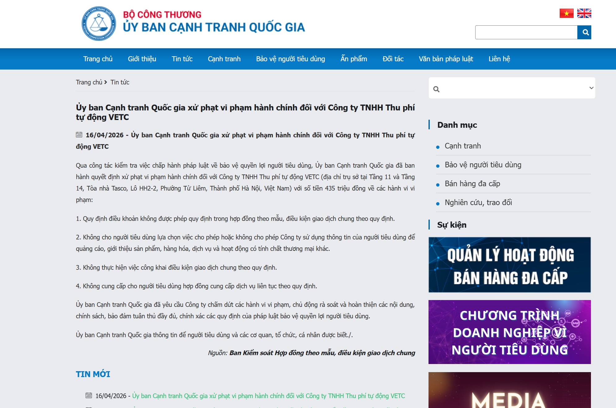 Ủy ban Cạnh tranh Quốc gia đã ban hành quyết định xử phạt vi phạm hành chính đối với Công ty TNHH Thu phí tự động VETC (địa chỉ trụ sở tại Tầng 11 và Tầng 14, Tòa nhà Tasco, Lô HH2-2, Phường Từ Liêm, Thành phố Hà Nội, Việt Nam) với số tiền 435 triệu đồng với 4 hành vi vi phạm.